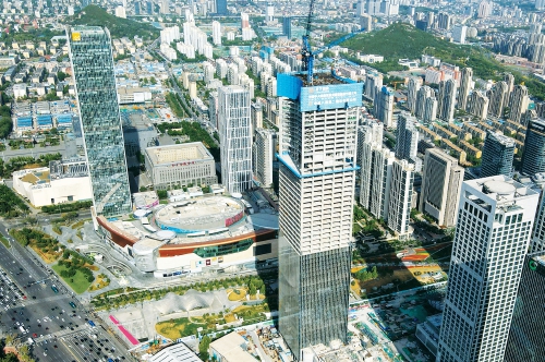 4月25日,在中央商务区核心区域,济南CBD中央广场18号地块项目的超高层建筑主塔楼施工正在向300米高度冲刺。据了解,该项目总建筑面积约21.8万平方米,主楼为318米,是目前济南在建的第五座300米以上超高层建筑,计划2026年竣工。(本报记者 崔健 摄)