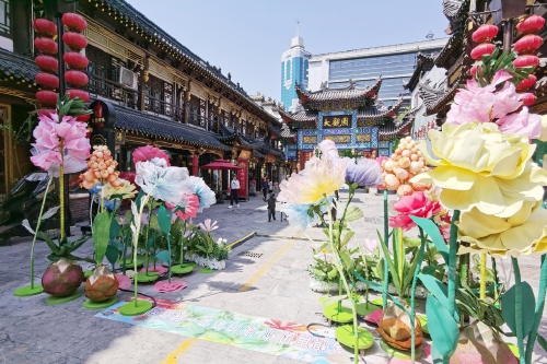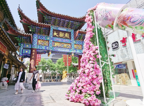 4月26日,走进济南大观园北门,一束巨型的仿真“玫瑰花束”吸引了不少市民游客关注。“五一”假期临近,有着近百年历史的济南大观园也装扮起来迎接市民和游客,多组仿真花卉造型亮相园区,其中一组高约3米的“玫瑰花束”形象逼真,粉色的花朵娇艳欲滴,既展现了济南市花的魅力,也为济南大观园古建筑群增添了一抹时尚的气息。(本报记者 崔健 摄)