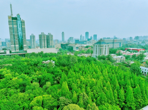 4月29日,泉城公园的水杉林郁郁葱葱,一棵棵水杉笔直矗立,从空中俯瞰一片翠绿,宛如“绿野仙踪”。 (王汗冰 摄)