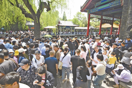 5月1日,众多游客在趵突泉公园内赏泉游玩。