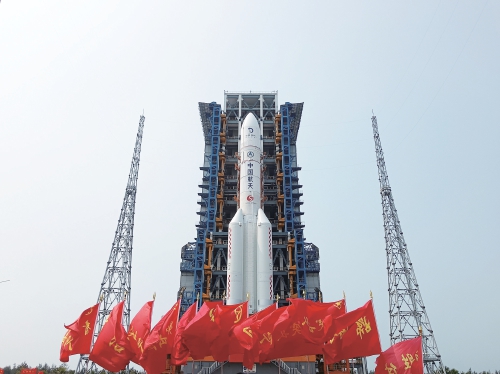 嫦娥六号探测器和长征五号遥八运载火箭器箭组合体矗立在发射区。(新华社发)