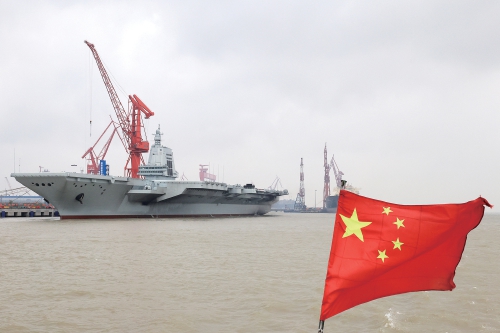 5月1日8时许,我国第三艘航空母舰福建舰从上海江南造船厂码头解缆启航,赴相关海域开展首次航行试验。这是首航前靠泊在码头的福建舰(4月30日摄)。(新华社发)