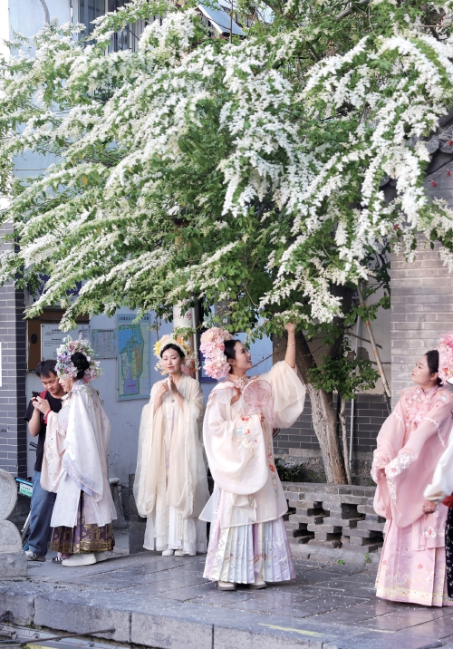 5月2日,济南老街随处可见簪花姑娘、簪花小伙,引爆了泉城的古韵国风。在曲水亭街、百花洲、起凤桥,头戴簪花身着汉服的女孩络绎不绝,犹如济南府里“流动的花园”,两三步距离,便有几位簪花姑娘打卡。满目皆是汉服,如同穿越一般,国潮氛围浓厚。 (本报记者 赵晓明 摄)