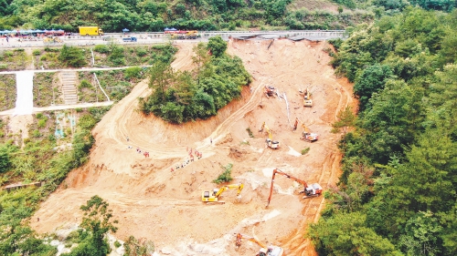 5月2日,救援力量在广东梅大高速茶阳路段塌方灾害现场作业(无人机照片)。(新华社发)