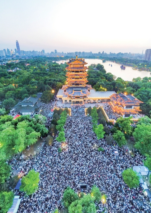 大批游客来到泉城广场,感受济南璀璨美丽的夜晚。