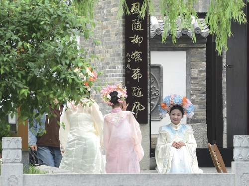 5月5日,“簪花姑娘”们在济南老城区的百花洲历史文化街区和曲水亭街拍照、游玩。“五一”假期,济南老城区游人如织,“簪花姑娘”优雅的身影融入古城老街,成为一道亮丽的风景。记者采访我市部分从事汉服体验的商家得知,假日期间簪花汉服预约出租业务十分繁忙,深受游客喜爱。 (本报记者 崔健 摄)