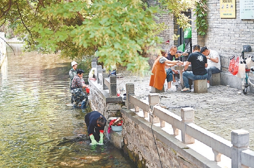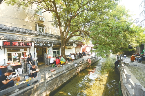 6日,初夏的于家桥一片翠绿,清冽的泉水缓缓流淌,水草随水流轻轻摇摆。于家桥位于济南市天桥区铜元局后街,午后不少附近居民在河边喝起扎啤,这里常年流淌着从五龙潭泉群向北流出的泉水,浸润着枕河而居寻常百姓的市井生活。 (王汗冰 摄)