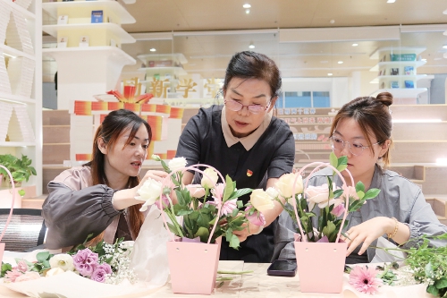 5月8日上午,在位于历下区文化东路街道的明湖国际信创产业园内,一场插花活动正在进行中。明亮温馨的场地中,活动的策划组织者、建达南苑社区党总支书记邹丽凤与青年白领们围坐在一起,享受着这轻松快乐的时光。