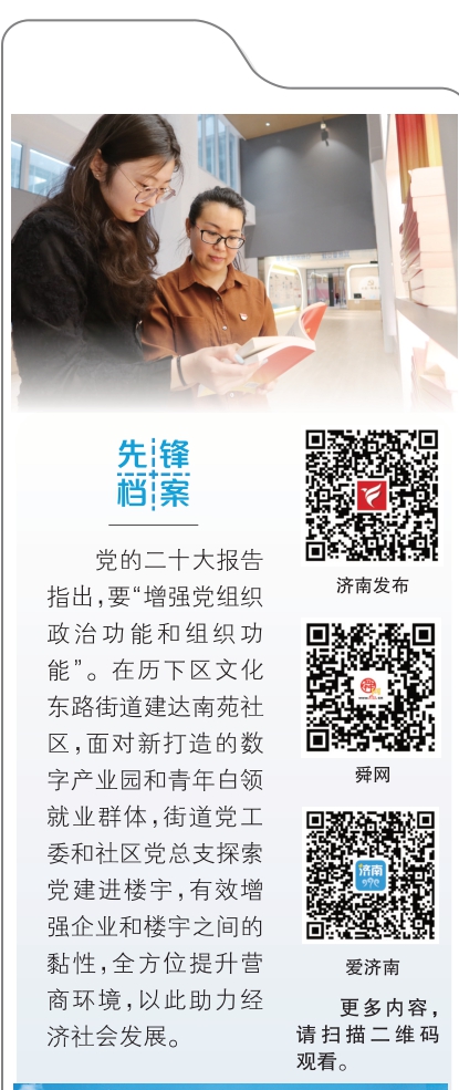 2021年,按照济南市对历下区“数字产业化的高地”的定位,明湖国际信创产业园启动招商和运营,陆续吸纳了37家数字产业企业入驻。当时,建达南苑社区党总支书记邹丽凤带领社区党员在园区内展开了走访和摸底。
