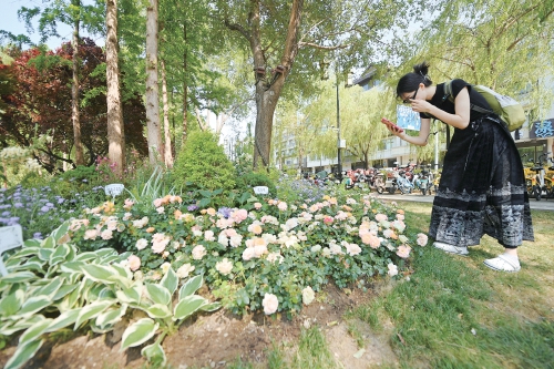 5月9日,初夏的大明湖景区内,蓝、红、黄花朵竞相绽放,一簇簇、一片片,在绿油油的草丛里落笔点缀,颜色丰富多彩,调出了油画般的“莫奈花园”,吸引了不少游客前来拍照打卡。这处走红的花园位于大明湖南岸玉斌府至水西桥区域,是“一湖一环”绿道项目提升改造工程的一部分,该区域共新铺设了2700多平方米草坪,建设了5处各色花卉交叉搭配的花径节点。(王汗冰 摄)