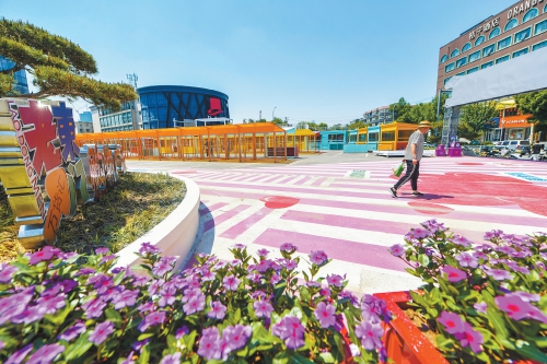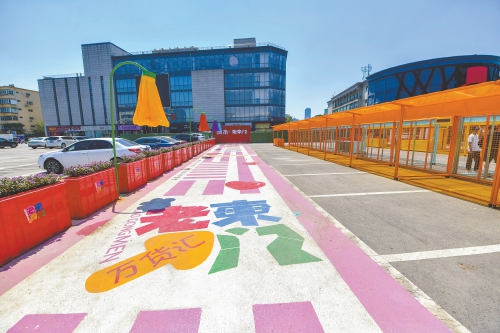 近日,记者在济南东关大街西首的老东门万货汇购物广场北门前看到,原来的停车场西侧区域进行了升级改造。该区域增加了彩色的集装箱式和棚架式摊位和商铺,地面喷绘了五彩的图案,将打造成为时尚气息浓郁的露天市集,进一步丰富老东门商圈的购物乐趣和体验。 (王锋 摄)