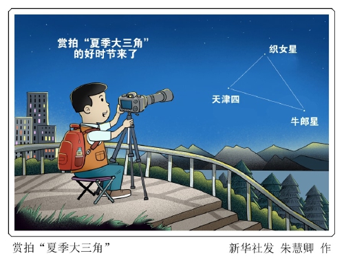 新华社天津5月13日电(记者 周润健)立夏后,天气转暖,气温升高。天文科普专家表示,由天琴座的织女星、天鹅座的天津四、天鹰座的牛郎星这三颗明亮的恒星组成的著名的“夏季大三角”入夜后已开始在东方逐一亮相,赏拍这个夜空中的“几何图形”逐渐迎来好时节。