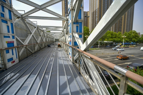 5月12日,在经十路与腊山河东路交叉口的过街天桥,桥体修缮改造已经全部开工。施工人员将桥面和步行梯的原有地面全部拆除,并重新粉刷了防锈漆,同时在地面安装不锈钢龙骨架,上方将重新铺装塑木地板,更加耐磨损的同时增加美观性。据了解,该过街天桥名为润华桥,以工业感较强的钢桁架结构呈现,造型美观,2011年建成启用,在当时经十路过街天桥步梯中首次增加了自行车辅助坡道。 (王锋 摄)