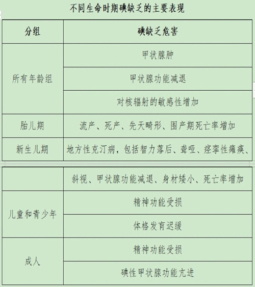 健康成人体内碘总量为20—50毫克,平均为30毫克,尽管人体内碘含量极低,却是机体各个系统、特别是神经系统发育所不可缺少的。碘在人体内每天都在代谢,在停止碘摄入的情况下,体内储备的碘仅够维持2—3个月。人体的碘完全依赖自然环境的供应,由于自然环境缺碘,造成人体碘摄入不足而发生的一系列疾病和危害的总称就是碘缺乏病,它包括地方性甲状腺肿、地方性克汀病、地方性亚临床克汀病、流产、早产、死产、先天畸形等。