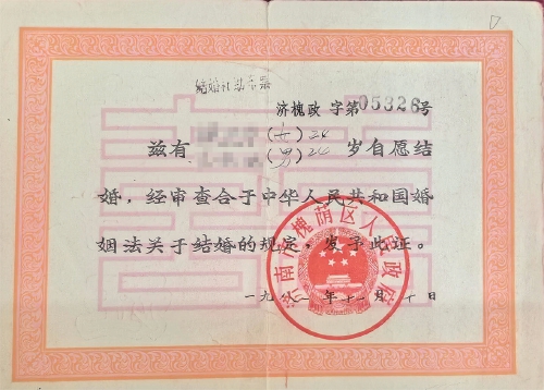 1987年,济南市历下区市民结婚证。