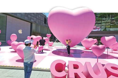 在济南泉城路中段一家商业综合体外,数十个巨型粉色心形装饰物亮相,成为泉城“金街”的别致景观,吸引了不少过路的市民驻足观赏。