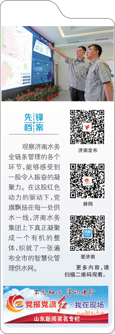 “近年来,随着济南城市建设和发展,常住居民人口的增长,以及供水面积的不断扩大,可以说我们的供水压力一直在不断加大。”济南水务集团党委书记、董事长崔鹏炜坦言,日益严峻的供水任务面前,他们始终坚持依靠党建来激活城市供水的发展动力,“必须建立一套科学智慧的供水管理系统,以更先进的技术手段来保障管网运行;与此同时,也必须锻造一支强有力的党员先锋队伍,凝聚起基层水务工作者的强大合力。”