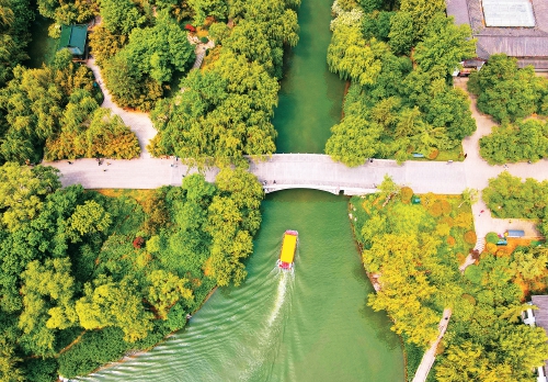 5月的泉城生机涌动,万物秀美。在蓝天白云之下,大明湖碧波荡漾,绿意盎然,画舫穿梭在湖面之上,景色之美让人沉醉。漫步大明湖畔,看荷叶吐绿,垂柳依依,夏日浪漫如碧波般荡漾眼前,游人尽享舒适惬意。 (本报记者 崔健 摄)