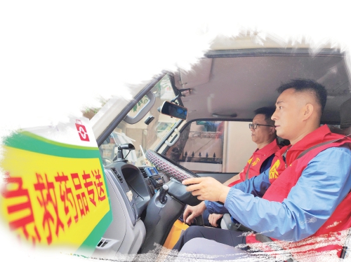 志愿者风雨疾驰,一辆辆急救药品专送车驶向患者家中。