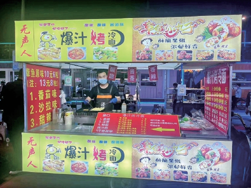 在这喧嚣之中,有一处别样的摊位,那是一对“90后”聋哑夫妻的小小天地,经营着章鱼小丸子和烤冷面。他们是聋哑人,可他们的梦想并未因此有丝毫残缺。