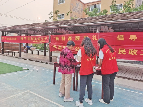 “历城区民政局将大力宣传中央及省市有关文件精神,继续弘扬中华民族忠贞爱情、家庭和睦的优良传统,以实际行动破旧立新、移风易俗,促进婚事新办、婚礼俭办,在全区营造节俭、文明的婚嫁氛围,推动社会主义核心价值观在家庭落地生根。”历城区民政局党组书记、局长李春迎说。为进一步深化移风易俗,破除陈规陋习,推动社会风气向上向善,近日,槐荫区兴福街道济西铁路生活区社区退役军人服务站志愿者走进社区,开展“抵制高额彩礼 倡导文明婚俗”宣传活动。
