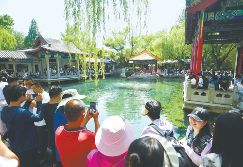 近日,游客在济南趵突泉畔赏泉,感受泉城风光。连日来,我市空气清新,气温较前期有明显下降,体感舒适,趵突泉畔特有的“小气候”更是沁人心脾,喷涌的泉水和如织的游人构成初夏时节生机勃勃的美好图景。