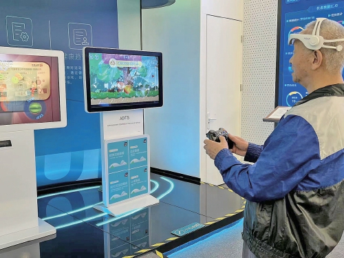 在该中心的智慧展厅中,几位老人正戴着VR眼镜进行闯关游戏。游戏期间,老人转动着身体念叨“往左、往右、加速“等与游戏有关的术语,时而发出爽朗的笑声,“我对电子设备比较感兴趣,这几个设备有VR和CR技术,能通过游戏闯关的模式,把康复训练植入到体感游戏运动中,既玩得开心,练得也带劲。”62岁的张立东(化名)表示。