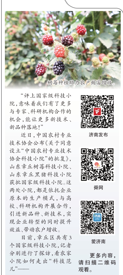 “如今,树莓品种越来越丰富、产量越来越高。这一切是从成立科技小院,对接上专家们开始的!”窦广磊告诉记者,2019年,树莓基地在章丘区科协的帮助下成立了科技小院,主要是与中国林科院、齐鲁师范学院、齐鲁工业大学等高校和科研机构合作。他说,由于之前树莓品种几乎全部由国外掌握,要靠自己去引进非常困难,但在中国林科院专家的带领下,基地成功引进了40余个品种,成为中国林科院的山东试验示范区、山东省树莓种质资源库,从中挑选最适合推广的品种进行大面积种植,带动更多农户增收致富。