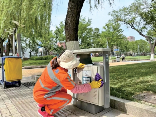 隔离护栏、果皮箱、座椅等城市家具展开全面的保洁作业。重点针对城市家具的底部、边角等不易保洁到的死