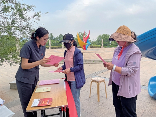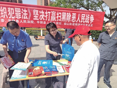 平阴县法院向群众发放宣传单,鼓励群众自觉参与到常态化扫黑除恶斗争中来。
