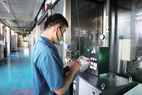 工作人员操作机器人生产线。