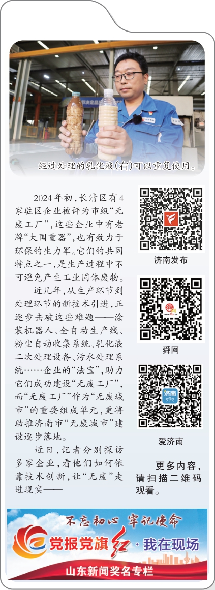 同样在今年获得市级“无废工厂”称号的中国石油集团济柴动力有限公司,在生产环节利用新的生产设备让原本的废弃物“变身”再生资源。“机械加工过程中会用到大量乳化液,起到切割时润滑、降温的作用,加工后就变成了脏污切削液,属于危险废物。有了这套设备,我们就能对其进行回收利用!”忙碌的生产车间里,企业机加分公司轴类加工部党支部书记王希斌指着一台机器介绍,这便是他们公司的乳化液净化设备。“这套设备可以对脏污切削液进行油水分离、杂质过滤、杀菌处理,你看,处理后的乳化液干净如新,还能继续循环使用!”王希斌说,净化后的乳化液质量稳定、安全性高,能重新投入生产。