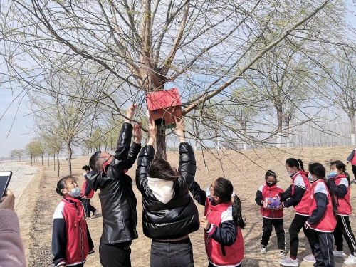 宜居的环境,志愿者和孩子们用废纸箱制作了一个个舒适的鸟巢……