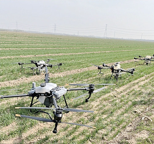 无人机沿着麦田低空飞过,在技术人员精准操控下,按照预设路线向田间喷洒药剂。