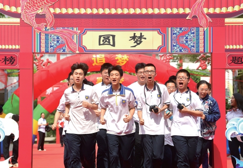 同学们排着整齐的队形,在学校的祝福中,喊着响亮的口号,精神抖擞地依次穿过拱门,响亮的口号喊出了他们努力拼搏的激情,喊出了他们对梦想的追逐,喊出了他们对未来的向往。师生互动环节,有师生代表的互动朗诵,有高三老师们的合唱祝福,更有各科教师为学生们送出的具有学科特色的毕业祝福。(本报记者 崔健 摄)