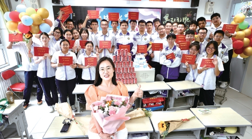 6月4日,济南中学(胜利校区)高三年级班主任为即将奔赴考场的学子准备了仪式感满满的“最后一课”,为他们送上温馨的考前祝福。学生们互相签名,三五成群地合影留念;老师们更是精心准备,提前一周采购了向日葵,祝福考生“一举夺魁”。