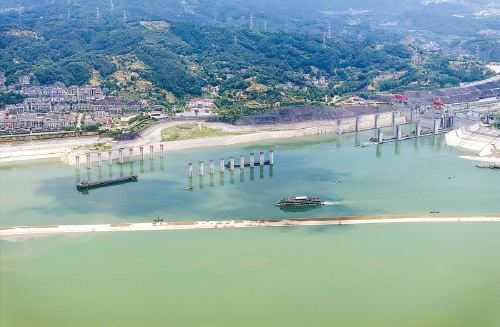 6月6日,船舶行驶在水位下降后的三峡坝前湖北省宜昌市夷陵区太平溪水域,岸边消落带清晰可见(无人机照片)。当日8时,三峡水库水位消落至145米,提前4天完成消落任务。这意味着三峡水库已腾出221.5亿立方米防洪库容,正式转入汛期防洪调度。 (新华社发)