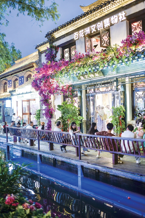 近日,在明府城的百花洲历史文化街区,沿街是古旧的宅子和潺潺的流水,夜幕降临时,各种装饰彩灯亮起,沿街店铺在夜色中散发出迷人风情。众游客夜晚来到老街巷,“慢”步或坐在河畔,看着潺潺流水和弯弯小桥,感受小桥流水人家的静谧与安详,体验老街的热闹和烟火气。 (王锋 摄)