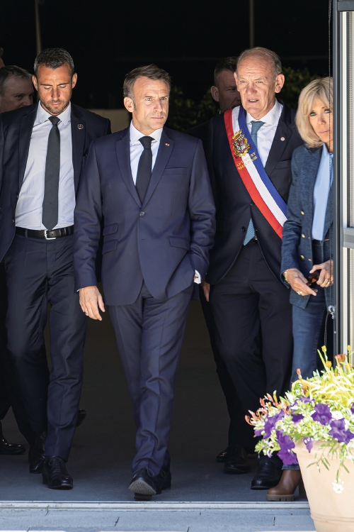 6月9日,在法国勒图凯市,法国总统马克龙(前左二)在参加欧洲议会选举投票后走出投票站。 (新华社发)