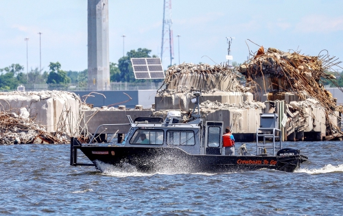 6月10日,在美国马里兰州巴尔的摩港,人们驾船经过“弗朗西斯·斯科特·基”大桥附近的撞桥事故残骸。美国联邦政府机构10日宣布,受3月26日撞桥事故严重影响的马里兰州巴尔的摩港商业航运当天全面恢复。(新华/路透)
