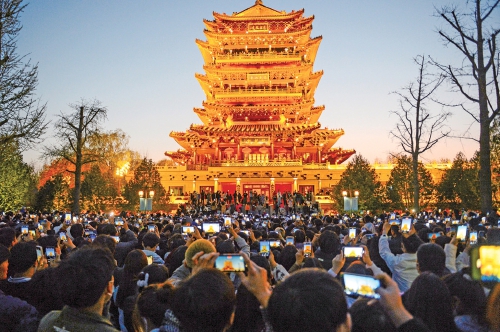 夜幕降临,千人观楼。(王锋 摄)