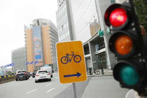 6月3日,在比利时布鲁塞尔,车辆驶过欧盟委员会大楼(资料照片)。 (新华社发)