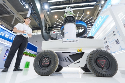 6月13日,在中建三局集团有限公司展区,一名工作人员在操作展示“移动式高精度测量机器人”。当日,2024北京-南京国际城市轨道交通展览会暨高峰论坛在南京国际博览中心开幕,活动将持续3天。