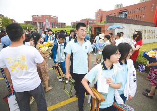 上午10:50,距离中考最后一场考试结束还有10分钟,山东省实验中学考场外的家长们就已经按捺不住,抱着送给孩子的礼物守在校门外。