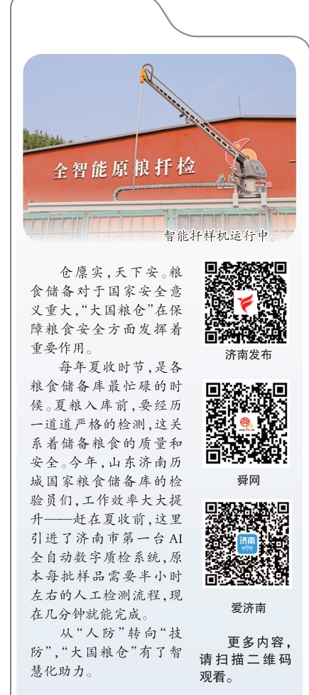 孙卫国说,历城国家粮食储备库通过构建覆盖原粮收购全业务流程和智能化管理的新模式,实现了原粮收购的扦检、留样、业务关联等多个环节的无人化值守,建立了溯源体系,实现了样品、车辆、检验结果的自动关联、安全生产和规避漏洞,通过现代化、标准化的收储流程实现降本增效,真正实现由传统“人防”向“技防”的转变,“优粮优储”得到有力保障。