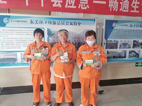 济南城管为环卫工发放防暑药品。