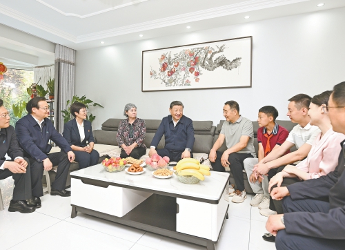 习近平来到社区居民赵守成家中,同一家人围坐在一起拉家常,了解他们的就业、收入、医保报销、孩子上学等情况,为他们的幸福生活点赞,鼓励孩子德智体美劳全面发展。赵守成告诉总书记,当地党委和政府十分关心社区建设,特别是在改造老旧小区、丰富居民文体生活等方面做了很多实事,各族群众在社区里和睦相处,生活过得很舒心。习近平强调,我们党是全心全意为人民服务的党,各族群众、家家户户都是我的牵挂。希望你们把家庭建设搞得更好,让日子越过越红火。