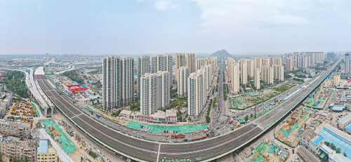 6月22日,在济南二环东高架路北段施工现场,重新建设的双向6车道高架路已经展露新貌。据了解,二环东高架路北段新建高架与改扩建中的零点立交桥实现对接,并向北延伸连接建设中的G104京岚线济南黄河公路大桥,通车后将实现从经十路直达黄河北新城区。目前新建高架段主体结构、沥青路面铺设和交通标志线施划基本完成,隔音声屏障也在安装之中。 (本报记者 崔健 摄)