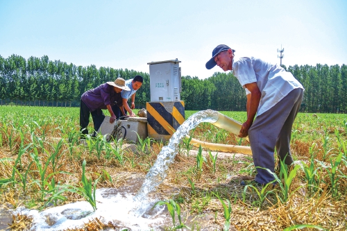 6月26日,济南市长清区文昌街道义合村村民在浇灌玉米秧苗。