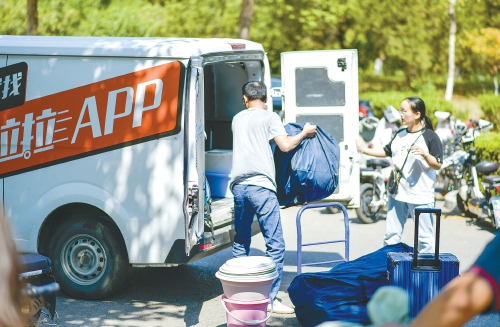 6月27日,一年一度的高校毕业季拉开帷幕,同时也是毕业生们的“搬家季”,众多毕业生告别校园返乡时,携带大量的生活用品和行李。在长清大学城一所大学校园内,不少居住在临近市、区(县)的毕业生开启了别样的返乡路,他们在网上预约了平时用于拉货的微型面包车和搬家服务,由货车司机负责将生活用品和行李搬运上车,毕业生还可以一同乘坐货车返回家乡,省去了自己买票和搬运的环节,返乡的路更加轻松。(王锋 摄)